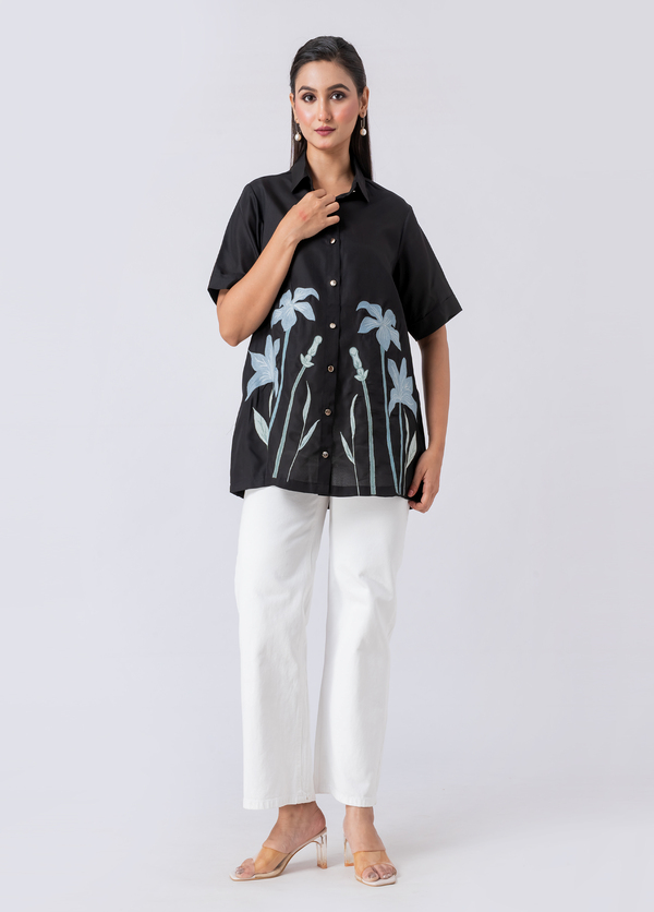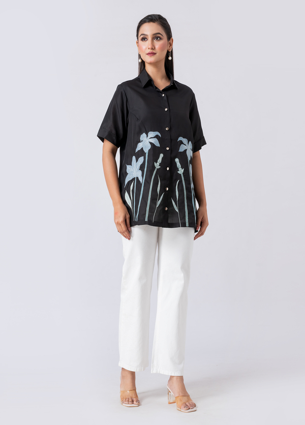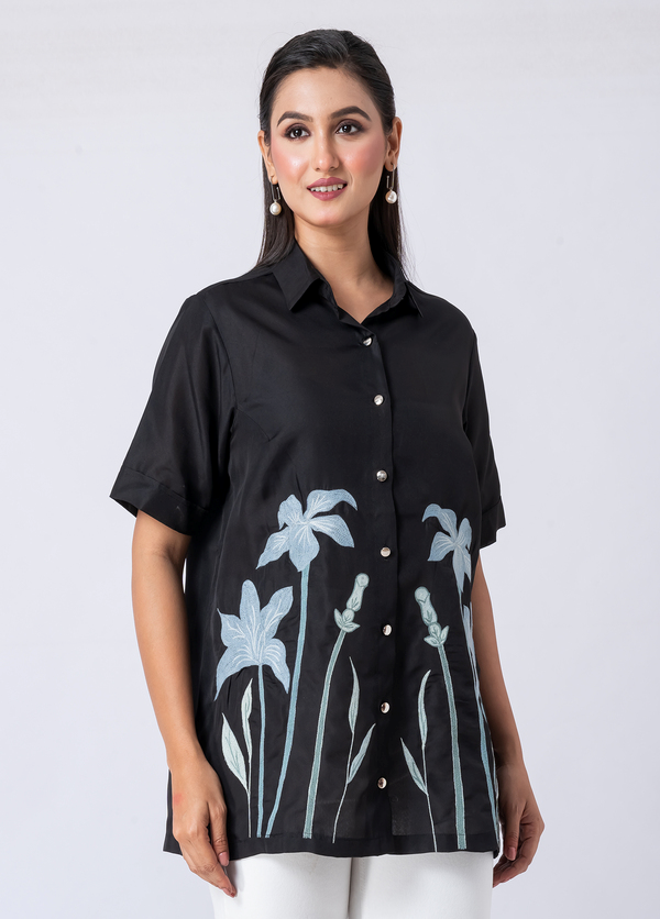 Blossom elegantly in this black crepe shirt, detailed with delicate threaded embroidery. Its collar neck and half sleeves offer a fresh, sophisticated Western style.