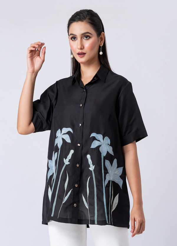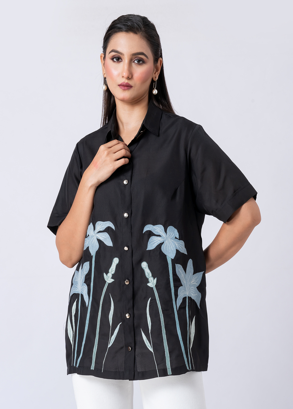 Chic black crepe shirt features a classic collar and half sleeves. It’s beautifully detailed with intricate thread embroidery, creating a unique and sophisticated piece for any occasion.