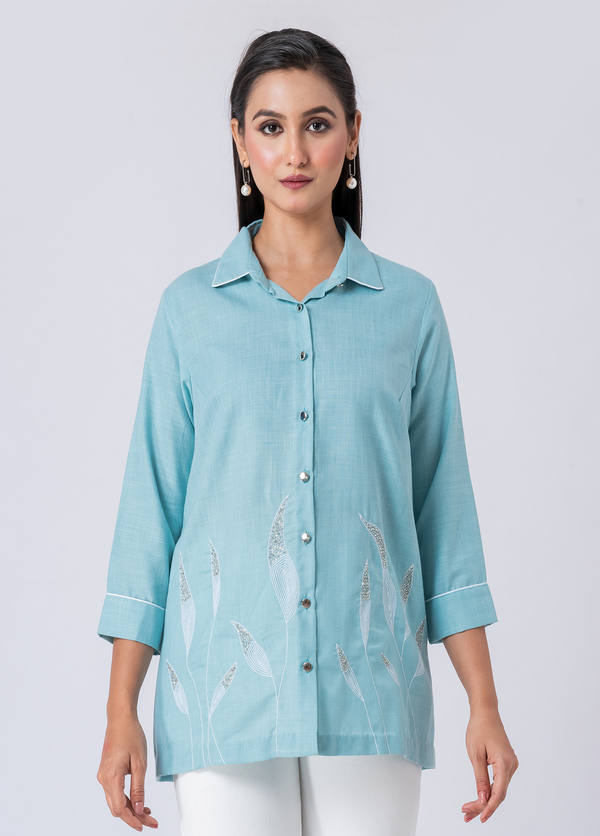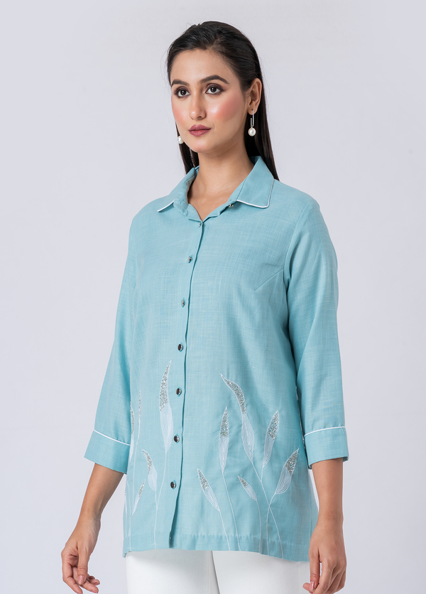 Blue cotton shirt is a stylish staple featuring a classic collar and full sleeves, with meticulous beadwork and hand embroidery for a sophisticated and unique touch.