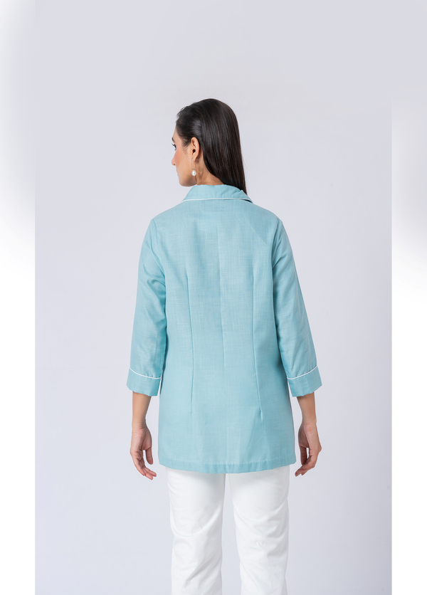 A dreamy blue cotton shirt featuring intricate bead and hand embroidery. With a timeless collar neck and full sleeves, it’s perfect for a sophisticated yet comfortable Western vibe.