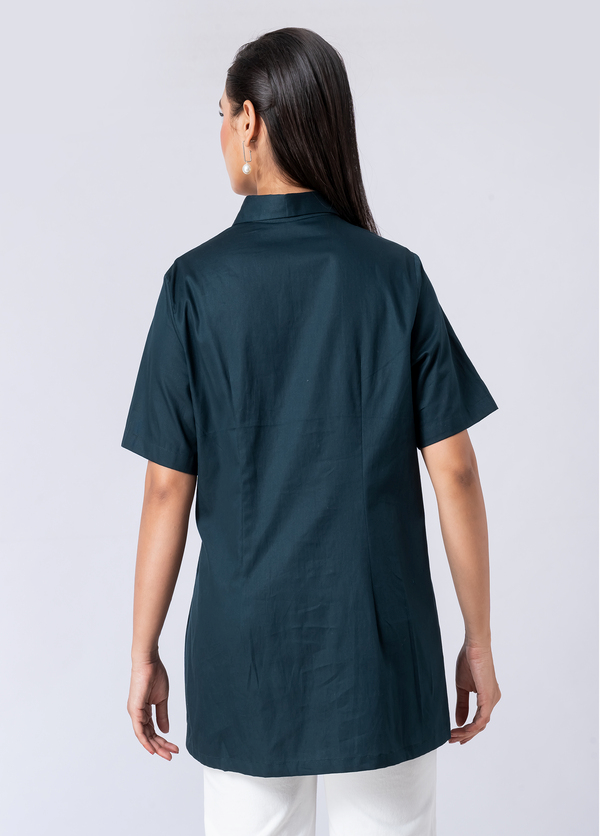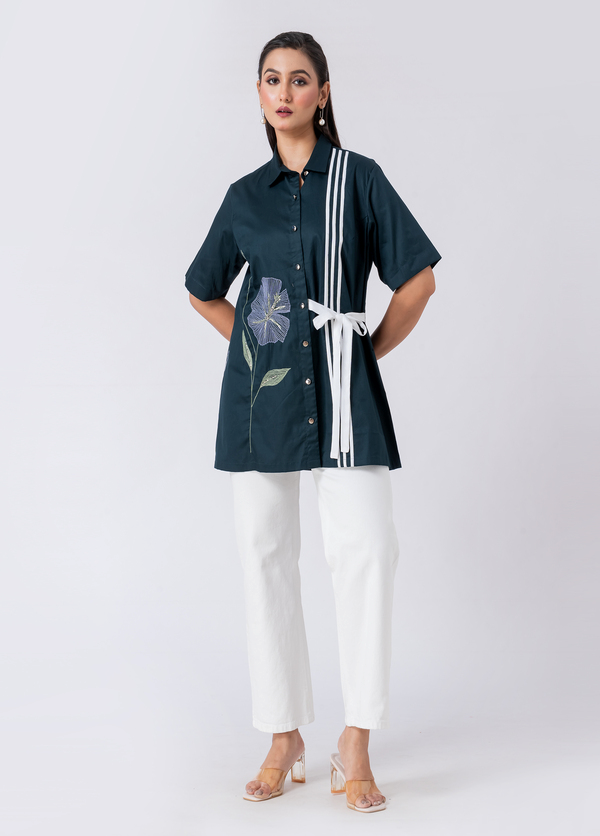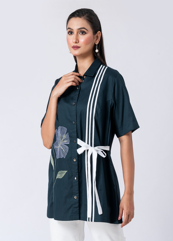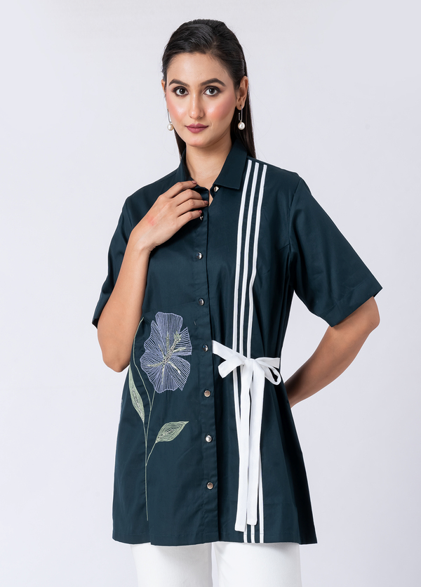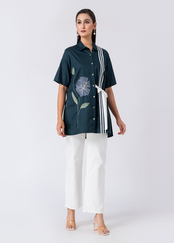 A vibrant green cotton shirt featuring stunning bead and hand embroidery. With a classic collar and half sleeves, it’s perfect for a sophisticated yet comfortable Western look.