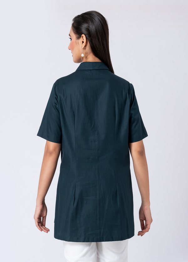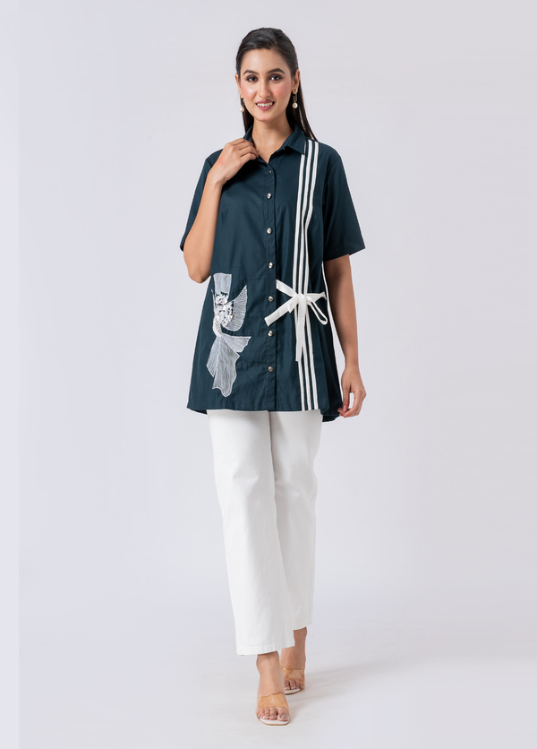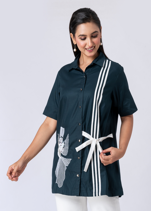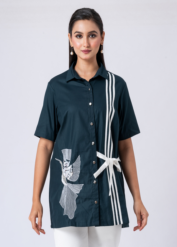 Take flight in style with this green cotton shirt, adorned with delicate bead and hand embroidery. Its collar neck and half sleeves offer a fresh, elegant Western vibe.