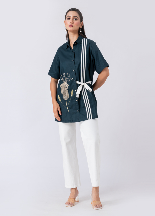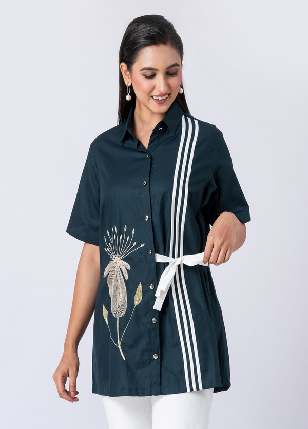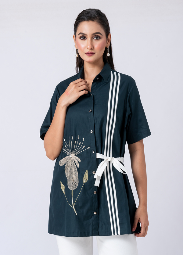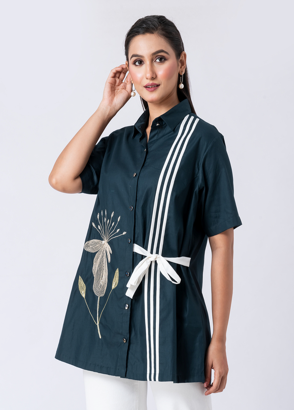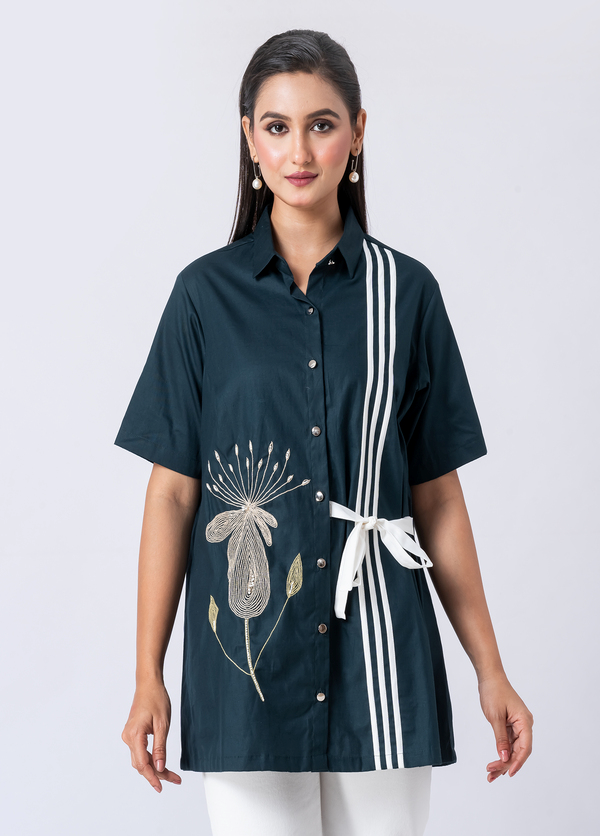 Add a pop of color with this green cotton shirt, delicately adorned with bead and hand embroidery. Its collar neck and half sleeves offer a fresh, charming Western look.