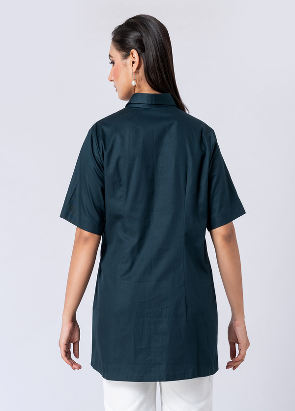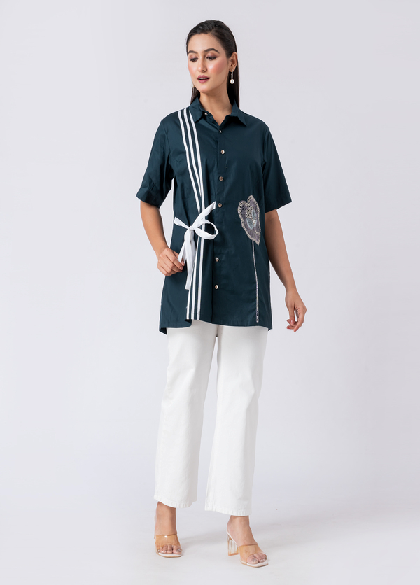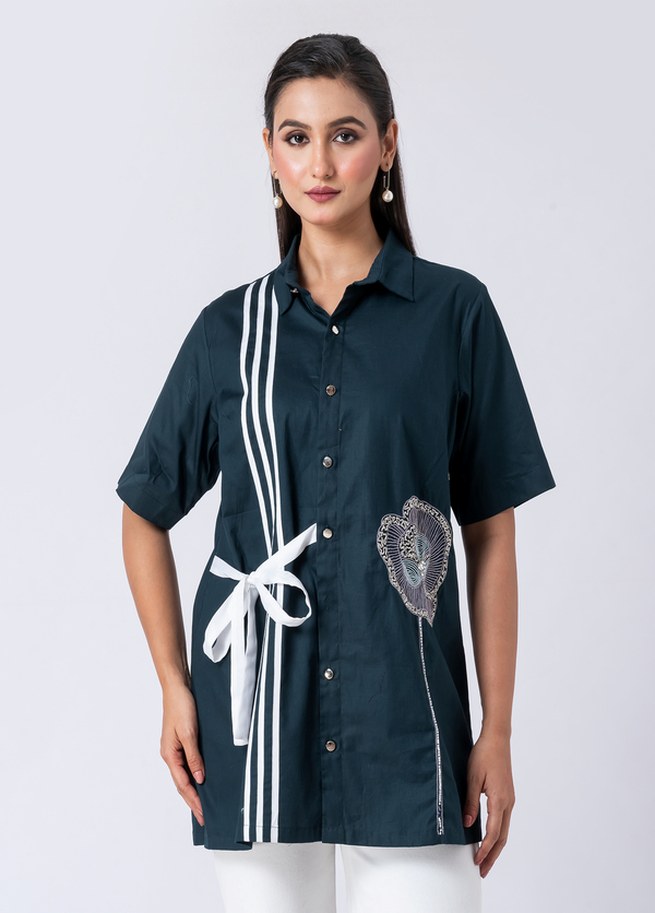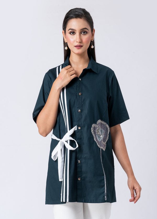 A charming green cotton shirt, featuring intricate bead and hand embroidery. With a classic collar and half sleeves, it’s perfect for a sophisticated yet comfortable Western style.