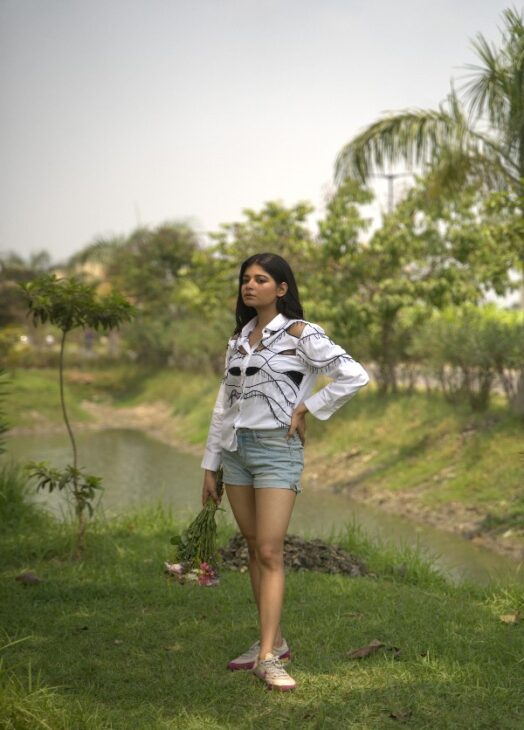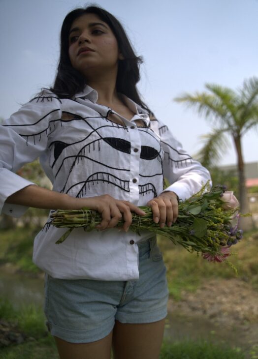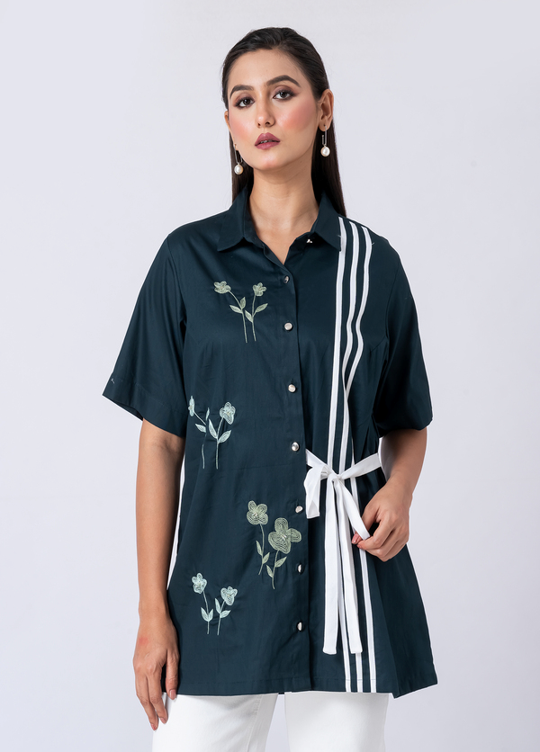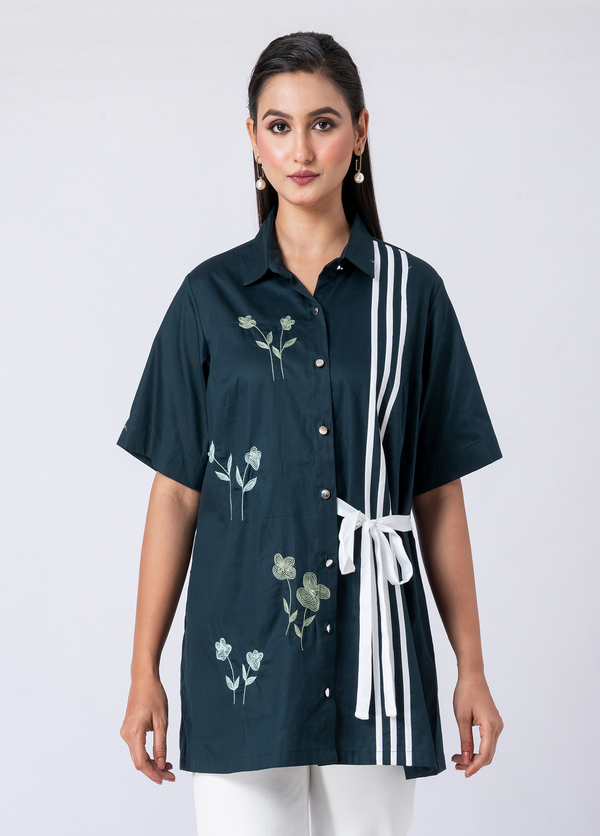 The Green Jade Shirt is a half-sleeved, green cotton shirt with a collar neck, embellished with bead and hand embroidery.