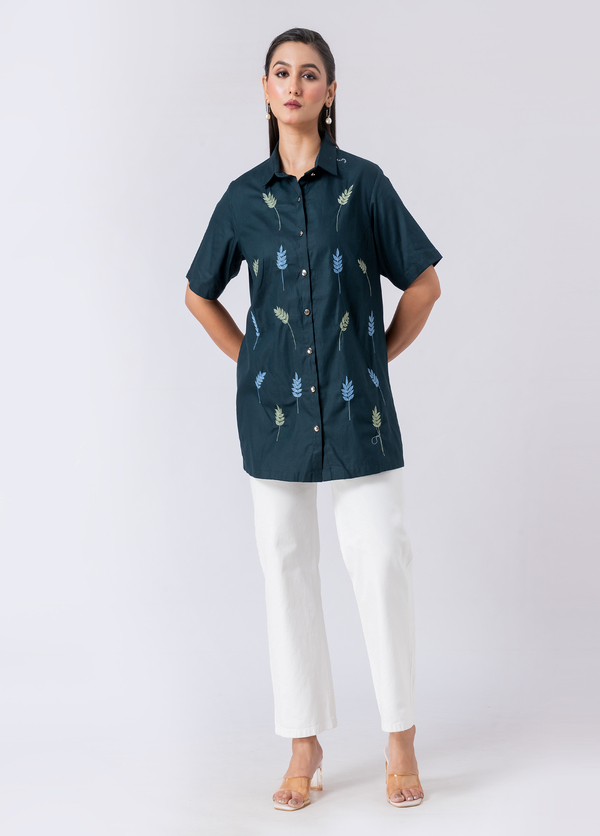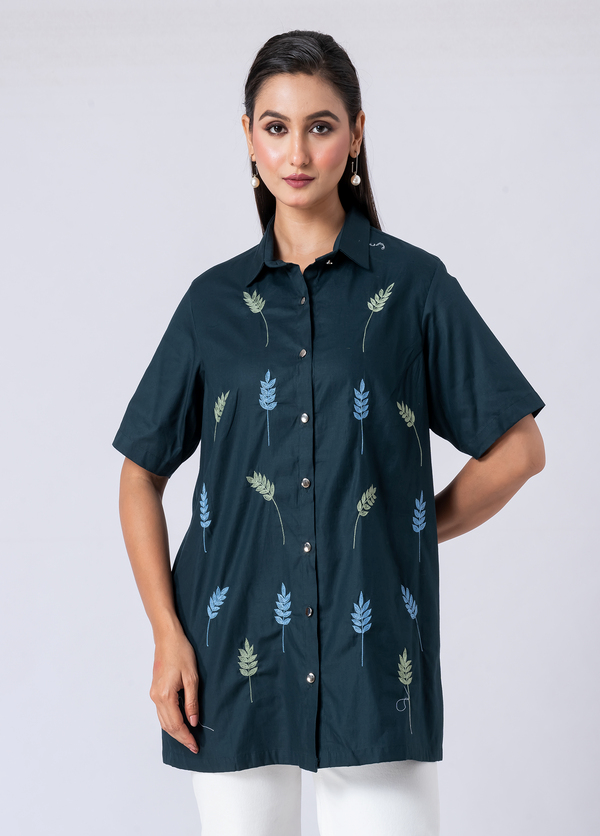 Embrace enigmatic charm in this green cotton shirt, adorned with exquisite bead and hand embroidery. Its collar neck and half sleeves offer a fresh, captivating Western allure.