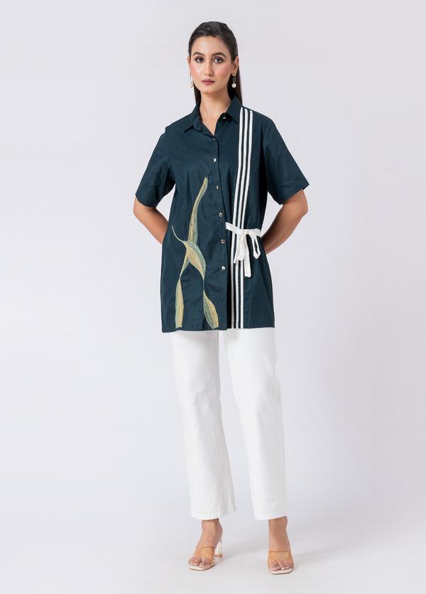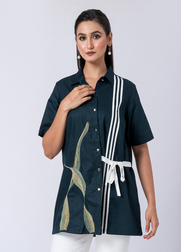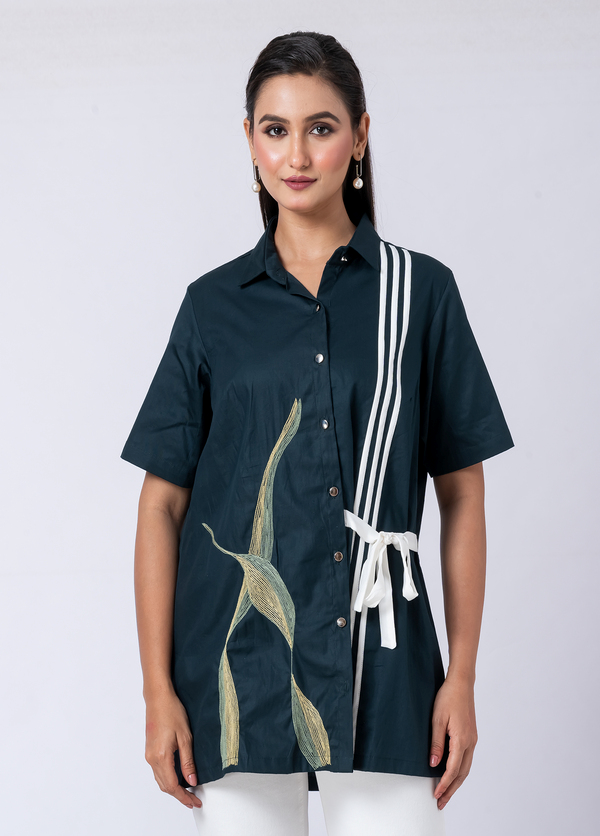 A lush green cotton shirt, featuring intricate bead and hand embroidery. With a classic collar and half sleeves, it’s perfect for a sophisticated yet breezy Western look.
